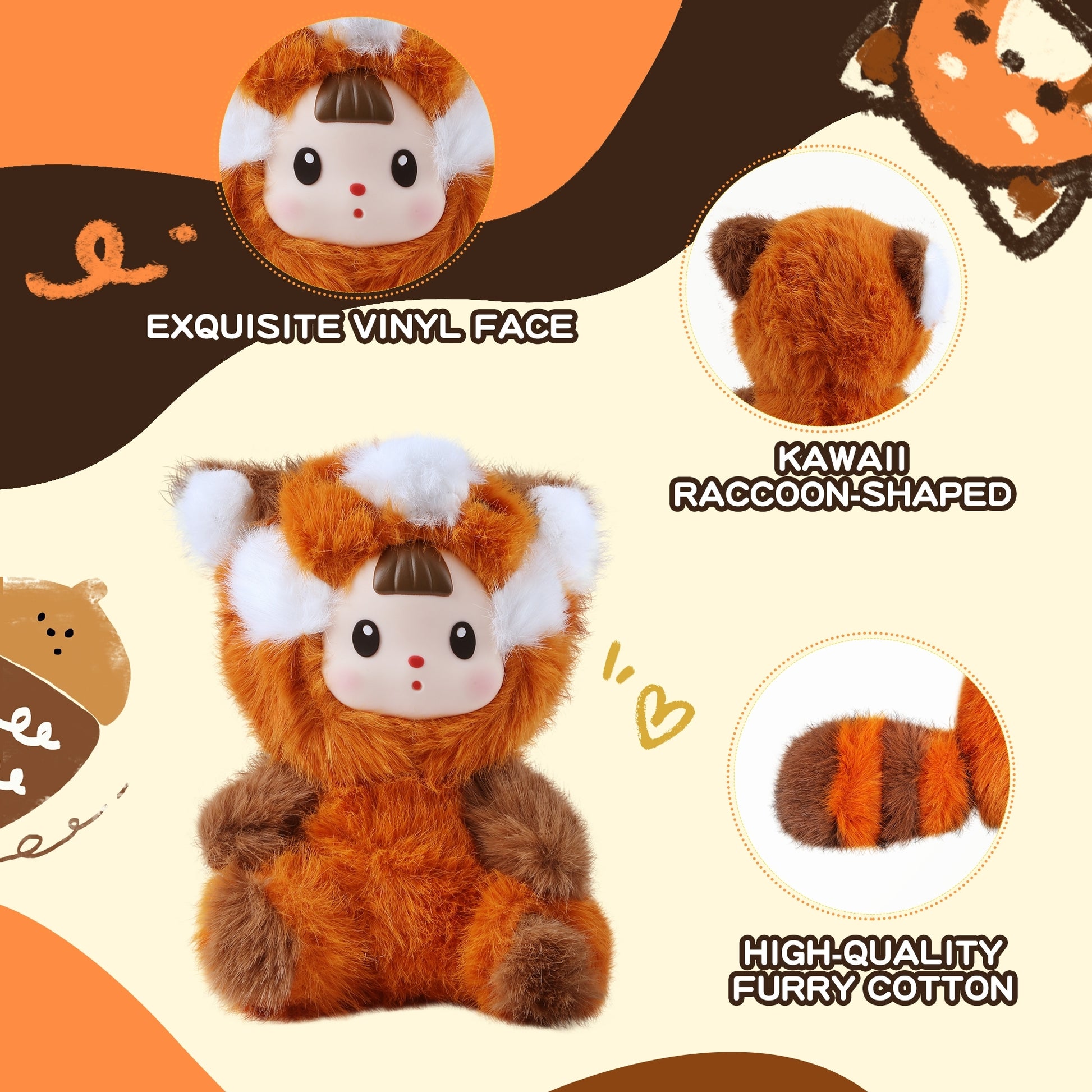 🦝 Unique Raccoon Design – A charming mix of fluffy plush and a vinyl face with bright eye details, this stuffed animal captures the playful spirit of a raccoon while adding a touch of kawaii cuteness to your space.